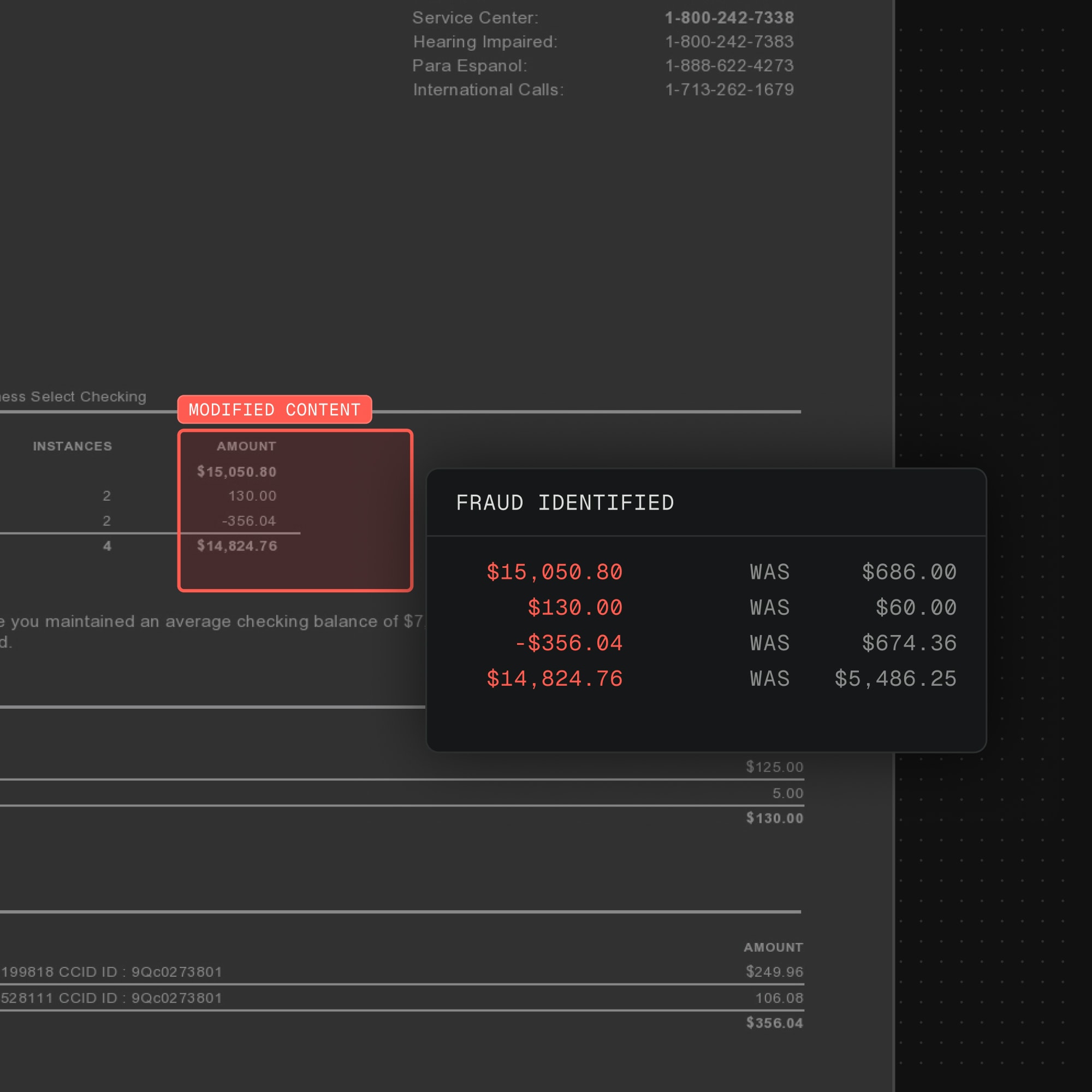 Advanced anti-fraud identifies modifications with institution-specific metadata analysis.