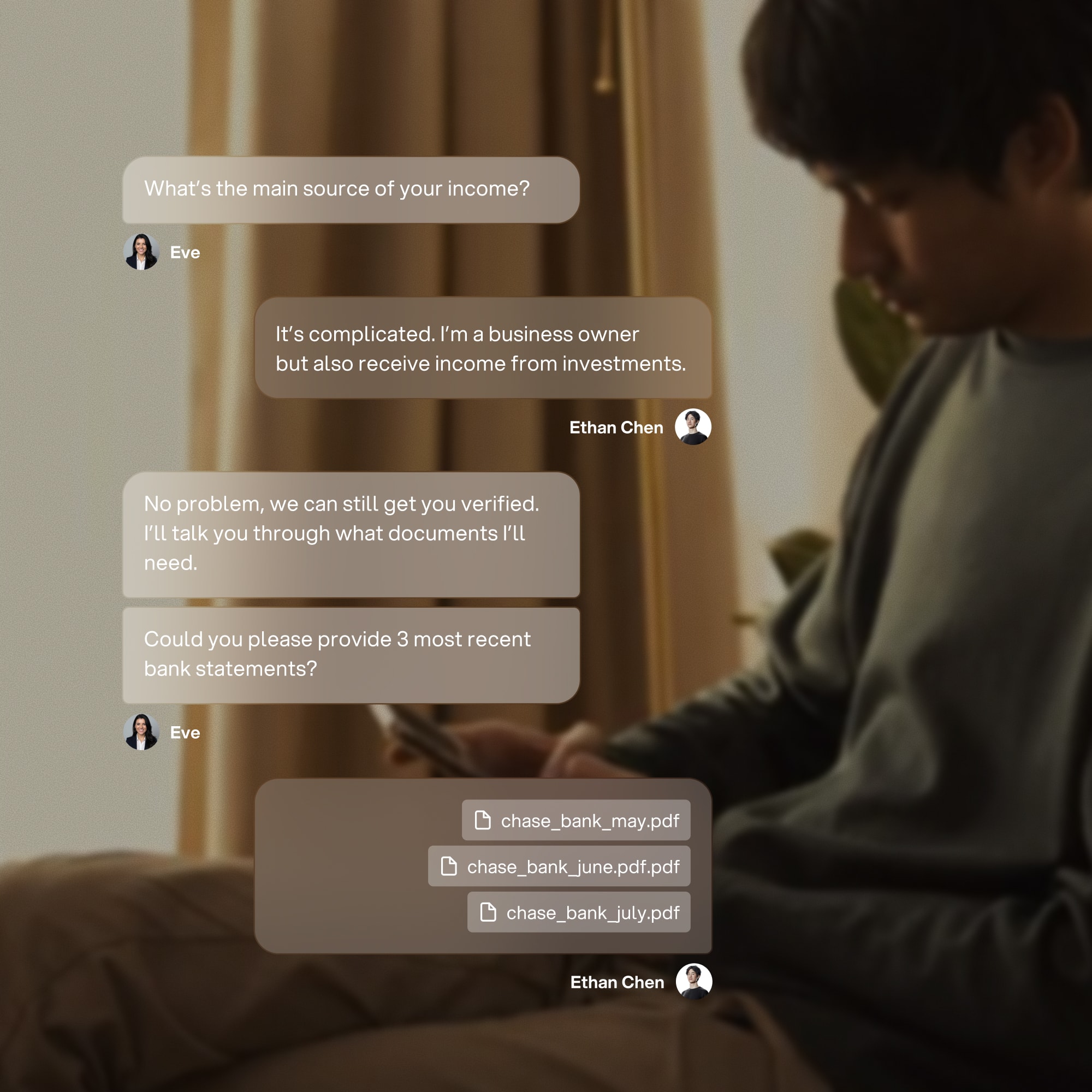 Agentic screening automatically collects documents, follows up, and reaches a decision all in one session.